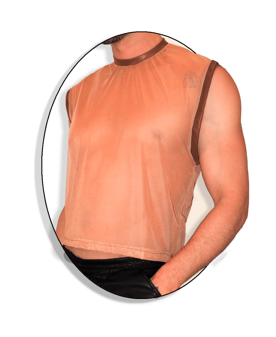 El cuello ribeteado en cuerina de 1,5 cm, del mismo color que el microtul, enmarca la parte superior del torso con precisión y aporta un contraste firme que ordena la transparencia.