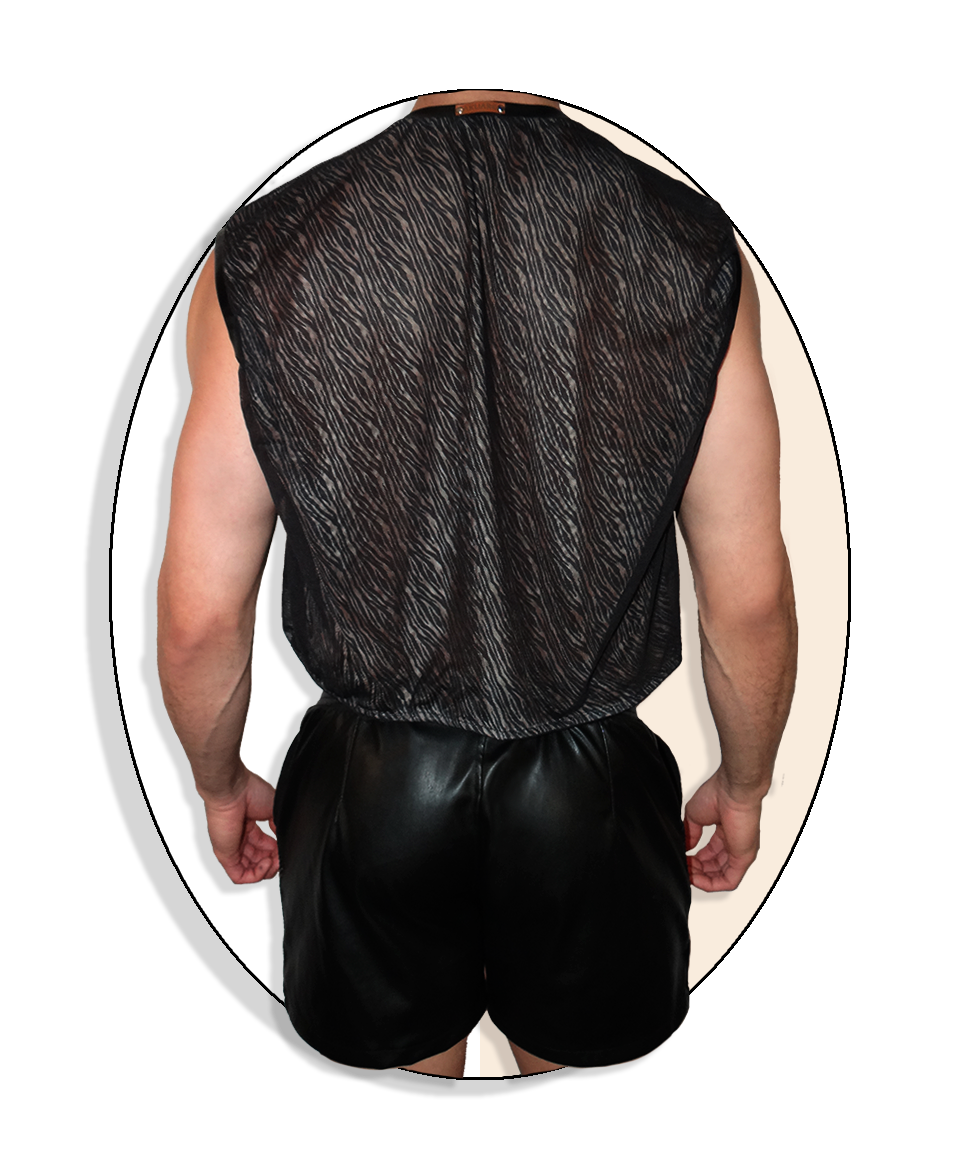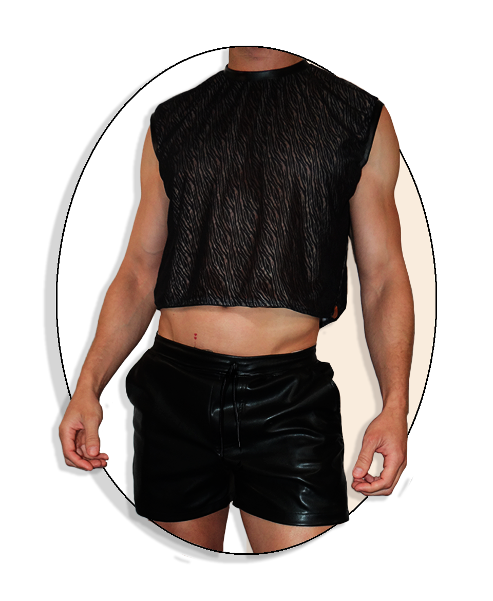 Las terminaciones prolijas y las costuras reforzadas aseguran durabilidad sin sacrificar suavidad. Juntas, las dos piezas generan una silueta que trabaja transparencia y brillo, piel y elasticidad, sombra y movimiento. La musculosa aporta profundidad y misterio; el short suma contraste y energía.