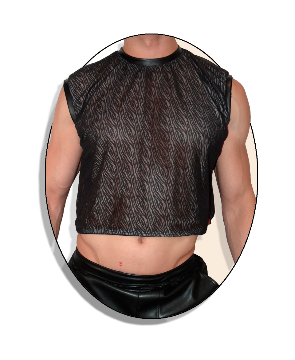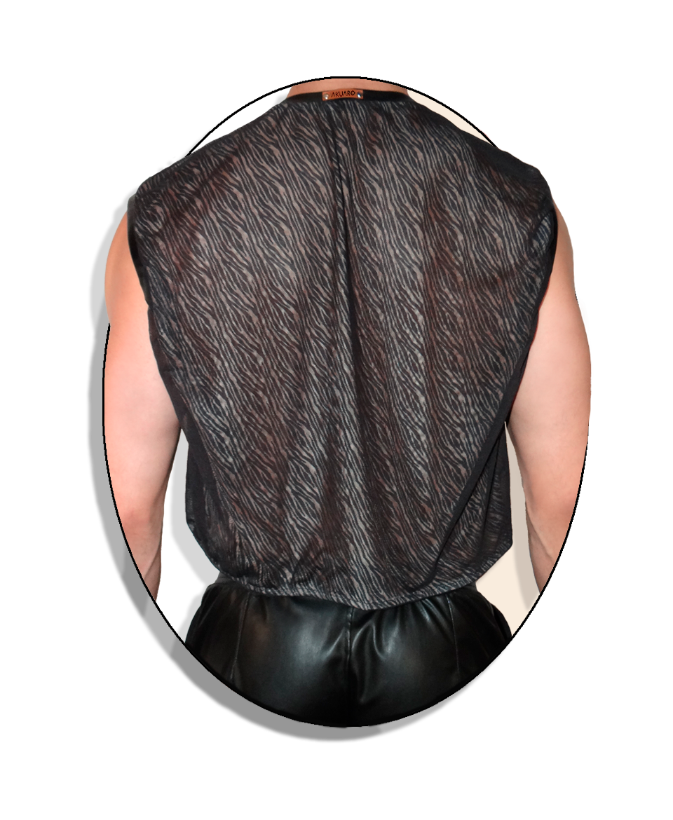 UMBRA de la familia ALQUIMIA, trabajando la transparencia desde la profundidad, el contraste y la transformación. Parte de la estructura clásica de una sleeveless tee, pero la reinterpreta mediante un sistema de microtul doble capa: una base interna con estampado animal print y una capa superior translúcida que filtra la piel con suavidad. El resultado es un efecto de luz y sombra que vibra con el movimiento.